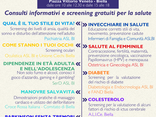 Durante la giornata saranno offerti consulti informativi e screening gratuiti da parte dei professionisti dell’ASL BI, insieme ai volontari di FAND Biella – Associazione Italiana Diabetici, Unione Italiana Ciechi, AMA Biella - Associazione Malattia di Alzheimer), A.L.I.Ce Biella (Associazione per la Lotta all’Ictus Cerebrale), A.P.B. - Amici Parkinsoniani Biellesi e Croce Rossa Italiana – Comitato di Biella su 8 tematiche inerenti la salute e la prevenzione: