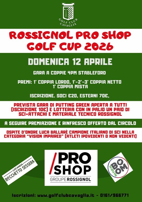 Domenica 12 aprile si giocherà l’evento Rossignol Pro Shop Golf Cup gara a coppie con formula 4pm (18 buche, Stableford - iscrizione gara soci 20€, esterni gara e green fee 70€). Prevista gara di putting green (iscrizione 10€) aperta a tutti (anche ai neofiti) e lotteria con in palio un paio di sci+attachi e materiale tecnico Rossignol. A seguire premiazione e rinfresco offerto dal circolo. Ospite d’onore Luca Ballarè pluri campione italiano di sci nella categoria “vision impaired” (atleti ipovedenti o non vedenti).