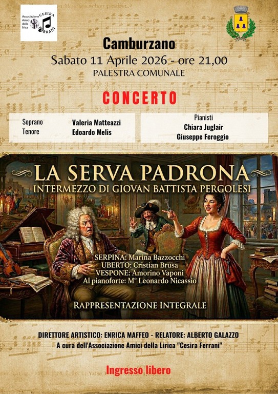Alle ore 21 di sabato 11 aprile si terrà la rappresentazione di ‘La Serva Padrona’ di Giovan Battista Pergolesi. L’evento sarà presso la palestra comunale di Camburzano e avrà ingresso libero.