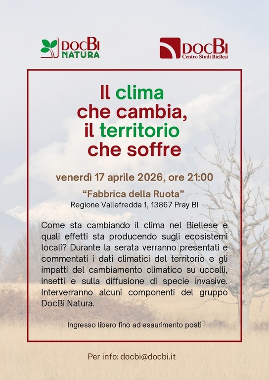 Un approfondimento sui cambiamenti climatici osservati nel Biellese e sui loro effetti sugli ecosistemi locali. È il tema dell’incontro dal titolo “Il clima che cambia, il territorio che soffre”, in programma venerdì 17 aprile, alle 21, alla Fabbrica della Ruota di Pray.