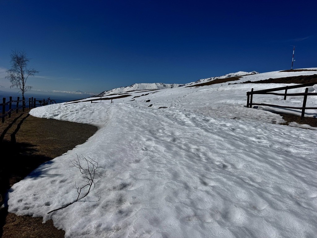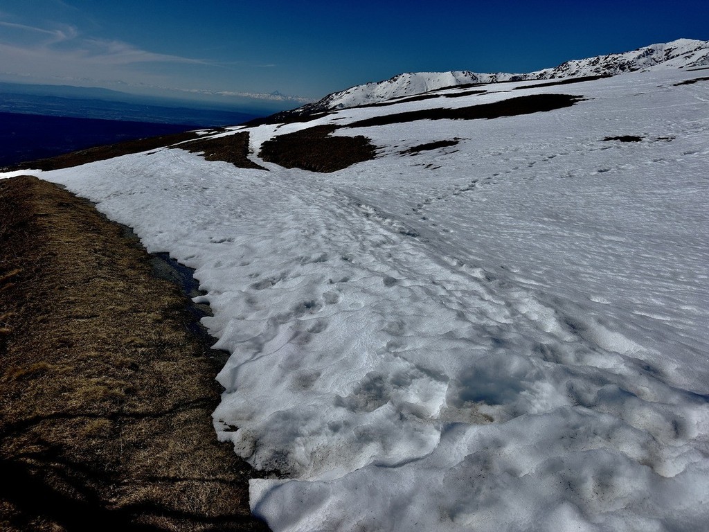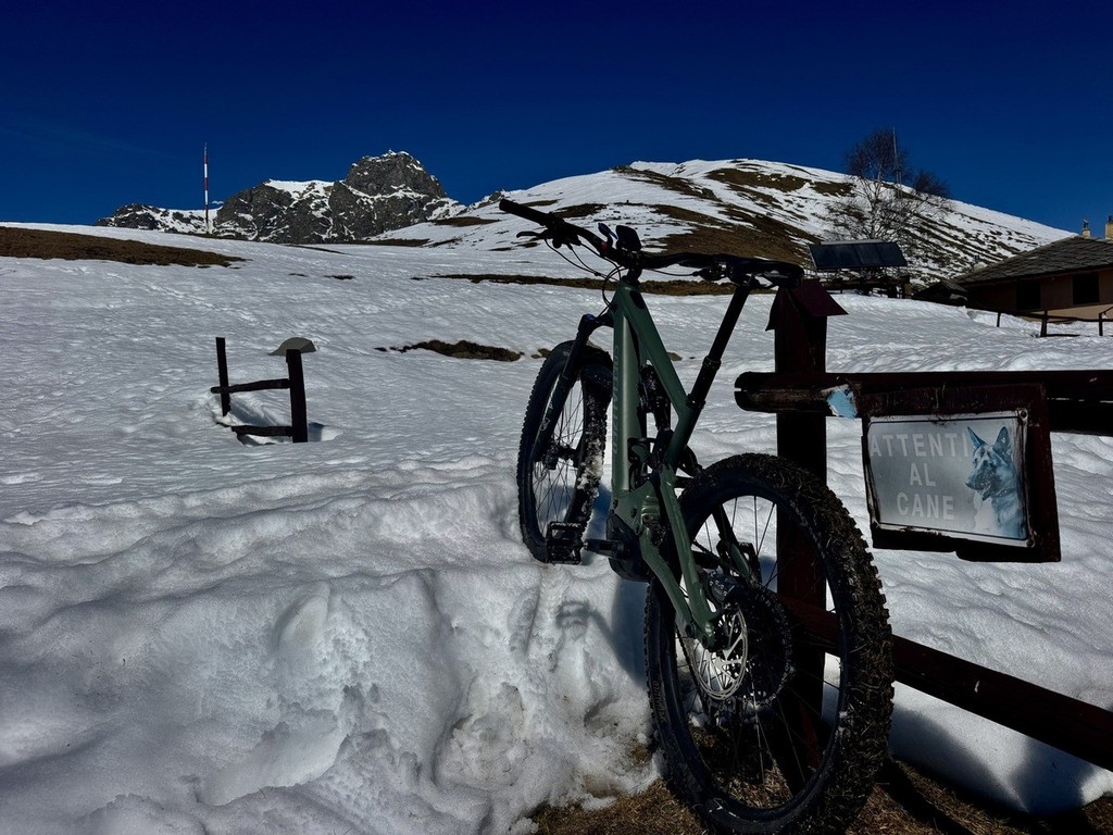 Riscaldamento in Burcina (tanto per cambiare...) quindi sentiero del trenino e poi su per la Muanda verso l'Alpetto Superiore. Quest'ultimo tratto sarebbe come sempre un piacevole sfogo muscolare se non fosse che la strada presenta ancora notevoli accumuli di neve e in qualche tratto occorre ricorrere allo "spintage classico".