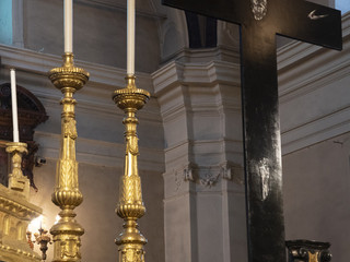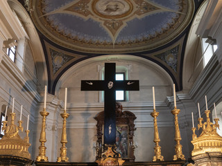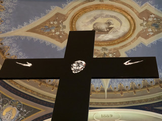 Si tratta della prima opera su commissione destinata a una chiesa per Lorenzo Puglisi, artista di origini biellesi. La Crocifissione è realizzata su una tavola monumentale di betulla alta oltre tre metri. La scelta del materiale richiama simbolicamente la rinascita e la giovinezza, in contrasto con l’oscurità profonda e i fiotti di luce che modellano i volumi, elementi distintivi della sua ricerca pittorica. L’opera si inserisce con essenzialità tra le volte in mattoni dell’oratorio cinquecentesco, entrando in dialogo con l’antico affresco dell’Agnello mistico conservato nell’abside.