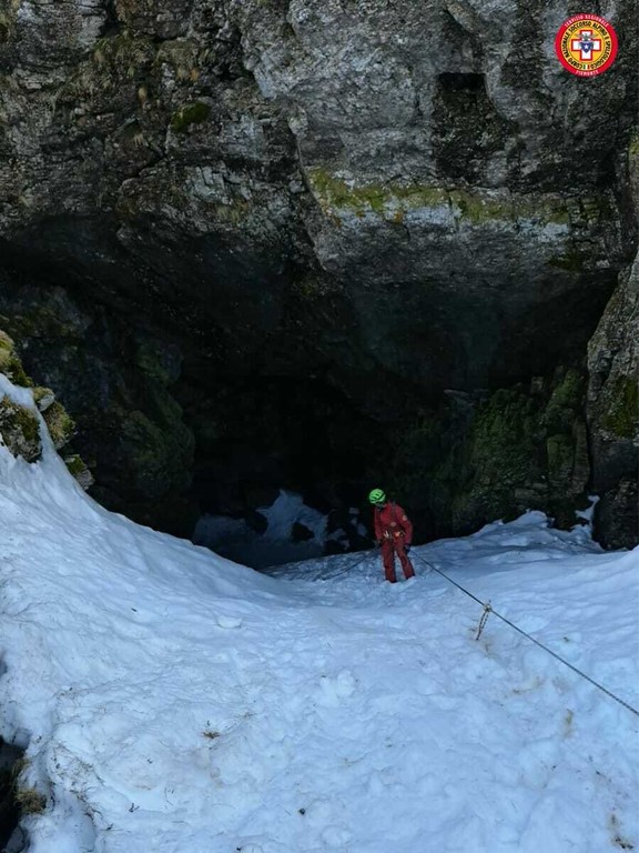 La fase di avvicinamento ha rappresentato uno degli elementi più impegnativi dell’intervento: i soccorritori hanno percorso circa 12 chilometri su neve, con un dislivello positivo di 800 metri e accumuli nevosi superiori ai due metri, trasportando a spalla il materiale tecnico necessario per le operazioni in grotta.