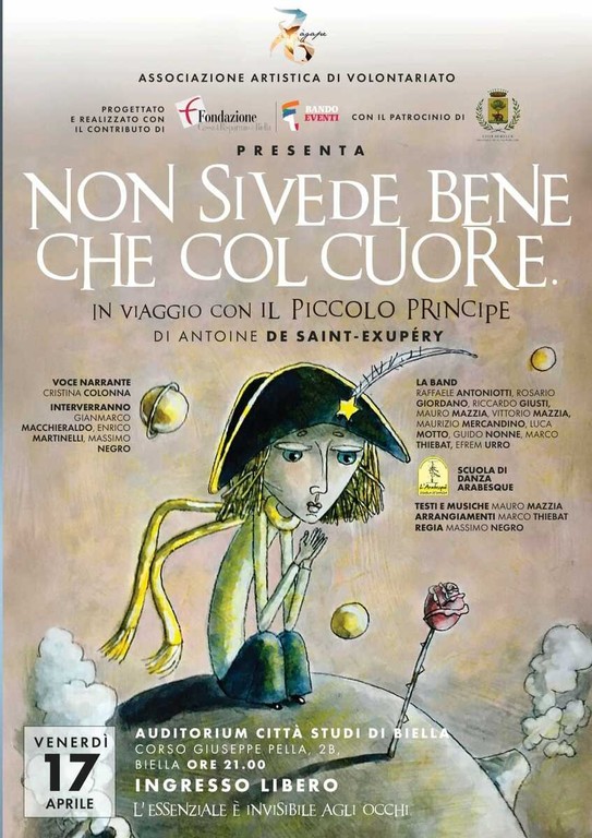 Venerdì 17 aprile l’Auditorium Città Studi di Biella, in corso Giuseppe Pella 2B, ospiterà lo spettacolo “Non si vede bene che col cuore – In viaggio con il Piccolo Principe”. Sono previsti due appuntamenti: alle 10 per le scuole superiori e alle 21 per il pubblico, con ingresso libero.