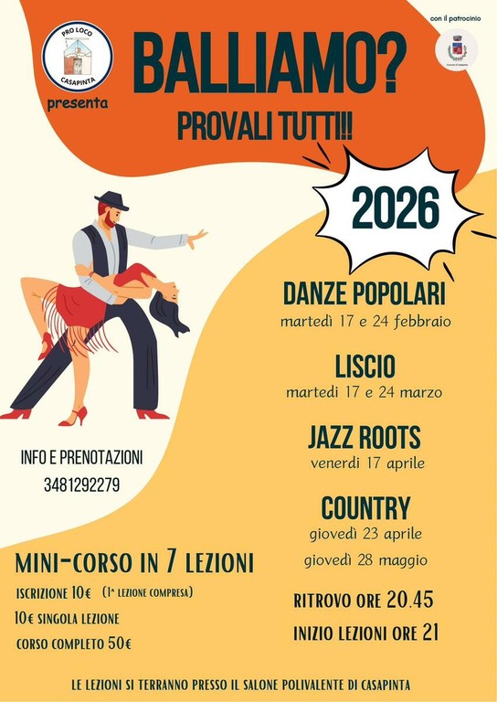 La Pro Loco di Casapinta, con il patrocinio del Comune, presenta “Balliamo? Provali tutti!!!”, mini-corso di danza articolato in sette lezioni, al salone polivalente di Casapinta.
