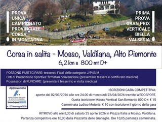 Si parte sabato con due eventi. A Mosso, in Valdilana, va in scena la 9ª edizione del Mosso Vertical San Bernardo, gara regionale di corsa in montagna organizzata dalla Polisportiva Pietro Micca – sezione Biella Running in collaborazione con la Pro Loco. Il percorso prevede 6 chilometri di sola salita con un dislivello di 800 metri. Il ritrovo è fissato alle 8.30 in piazza Italia, con partenza alle 10 dal centro storico. Accanto alla gara competitiva è prevista anche una camminata ludico-motoria, aperta a tutti, con partenza alle 10.05. Possono partecipare tutti senza alcun certificato medico. Il percorso è di Km. 6,0 di sola salita DISLIVELLO 800 D+ 15% asfalto. Quota della Mosso Vertical 800 D+: 15 € Sarà possibile iscriversi il giorno della gara entro le ore 9 e 30 al costo di 20 €; Camminata Ludico Motoria: Costo Iscrizione € 10 con iscrizione il giorno della gara.