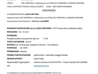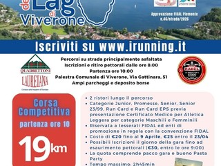 Domenica 26 aprile ci si sposta a Viverone per il 10° Giro del Lago di Viverone, gara su strada con partenza alle 10 dalla palestra comunale. Due le distanze previste: la competitiva di 19 chilometri, riservata ai tesserati e con due punti ristoro lungo il percorso, e la non competitiva di 8 chilometri, con partenza alle 10.10. Il tracciato, prevalentemente asfaltato, propone anche un nuovo percorso panoramico denominato “Giro dei due Comuni”, che attraversa luoghi caratteristici come la Panchina Gigante, il Ricetto della Rolle e il Castello di Roppolo. Per la competitiva sono possibili le Iscrizioni il giorno della gara fino ad esaurimento pettorali (€30, entro le ore 9) e la quota comprende pacco gara e buono Pasta Party Tempo massimo: 2h45min; per la non competitiva da 8 km con partenza alle 10,10 Nuovo percorso Panoramico “Giro dei 2 Comuni” (Panchina Gigante, Ricetto della Rolle e Castello di Roppolo) Costo di €8 con iscrizione e pagamento il giorno della gara La quota comprende pacco gara e buono Pasta Party.