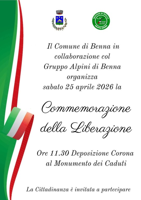 Anche il Comune di Benna si prepara a celebrare il 25 aprile 2026, giornata simbolo della Liberazione italiana, con una cerimonia commemorativa organizzata in collaborazione con il Gruppo Alpini di Benna.
