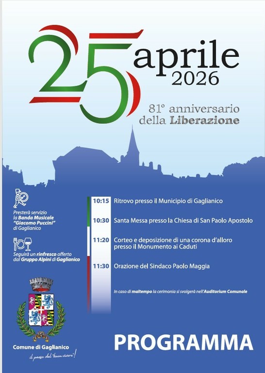 La giornata celebrativa prenderà il via domani, sabato 25 aprile alle ore 10,15 con il ritrovo presso il Municipio di Gaglianico. A seguire, alle 10:30, sarà celebrata la Santa Messa nella Chiesa di San Paolo Apostolo, momento di raccoglimento e riflessione per tutta la comunità.