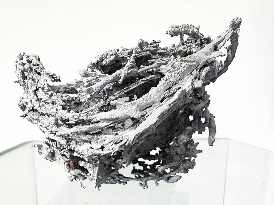 Nest richiama uno dei temi ricorrenti nella ricerca di Maura Banfo: il nido, qui reinterpretato in alluminio. L’opera rielabora il concetto di abitazione a partire dalla sua forma più essenziale presente in natura. Nella sua apertura alla trasformazione, il nido diventa anche un invito a considerare la natura come modello e riferimento per il presente.